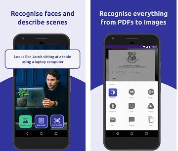 Aplicación que mediante la cámara describe lo que se enfoque: colores, documentos, cartas complejas, archivos pdf e imágenes que se encuentren dentro del dispositivo.