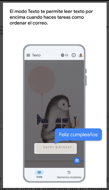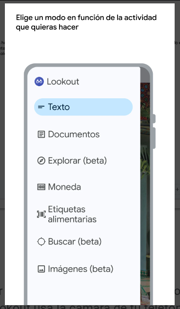 Lookout es una aplicación que usa la cámara y los sensores del dispositivo que se esté utilizando para reconocer objetos y texto para así ayudar a las personas invidentes o con discapacidad visual a obtener información sobre el mundo que les rodea.