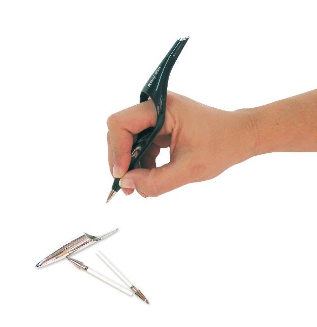 Bolígrafo con forma de anillo que permite controlar el temblor de la mano y ayuda a escribir de una manera correcta. El dedo se introduce en el anillo creando una postura sólida y ergonómica. No aprieta y no duele. Puede ser usado con el pie