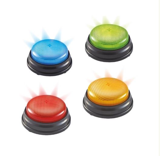 Cada uno de los 4 buzzers se enciende emitiendo un ruido distinto al apretarlos. Una herramienta ideal para aprender la relación causa efecto de una manera simple. Al mismo tiempo ayuda a preparar la utilización de pulsadores en una perspectiva de control de juegos, de material informático o de entorno.