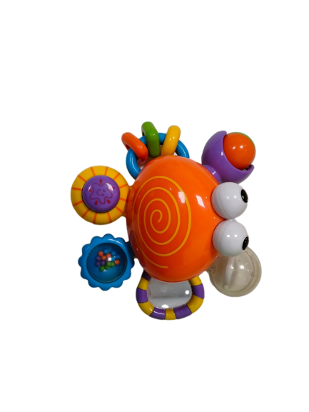 Cangrejo de juguete para atención temprana. Cada pata del cangrejo tiene diferentes variantes como son un botón que emite un sonido, aros o pelotas pequeñas.