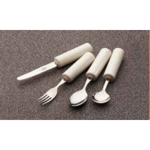 Gama de cubiertos de acero inoxidable montados en una base plástica cilíndrica que posibilita su mejor agarre. Indicado para personas con problemas de la función de agarre.