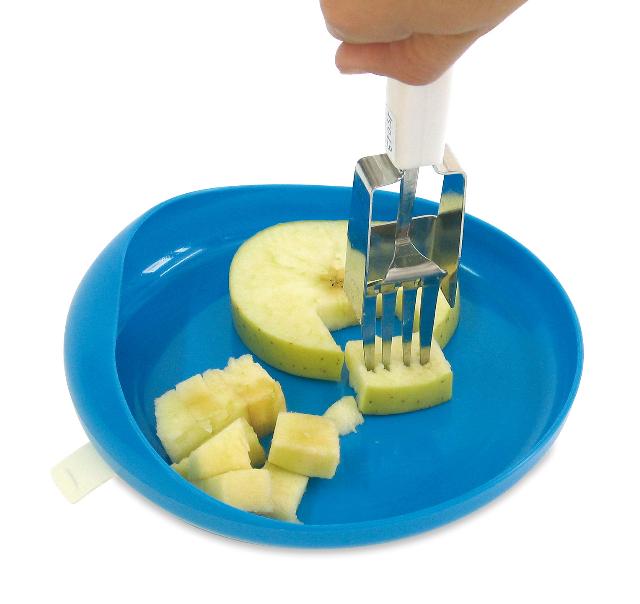 Este es un tipo de cuchillo-tenedor especialmente útil para personas amputadas de un miembro superior o con afectación de un lado del cuerpo como la hemiplejía, por ejemplo. Corta una pequeña porción sólo con bajar la mano, y vuelve a su posición, lo que lo convierte en un utensilio muy seguro y funcional.