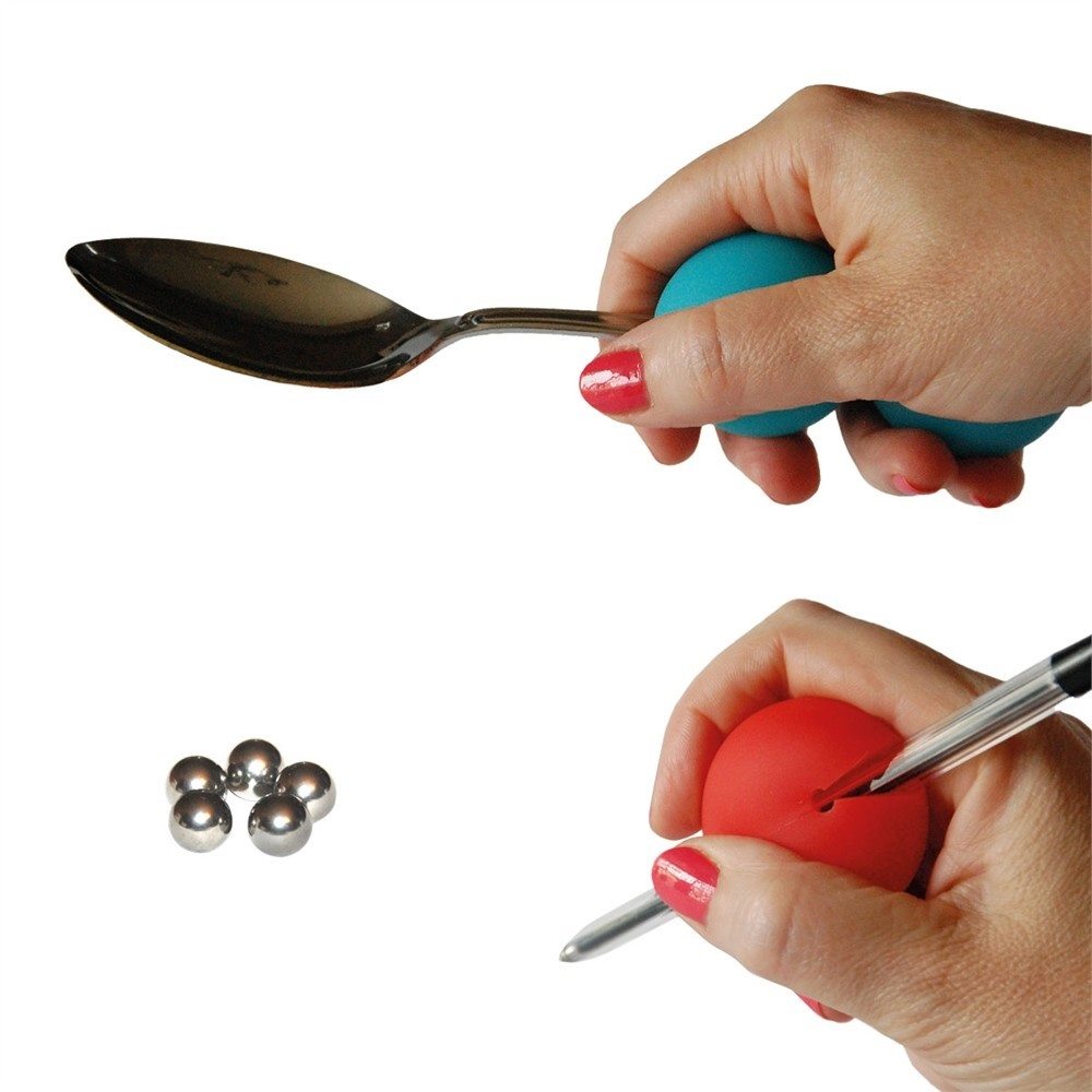 Una ayuda eficaz recomendada para los problemas de sujeción. Estas bolitas pequeñas de plástico flexible caben perfectamente en la palma de la mano tanto de niños como adultos. Se adaptan a los cubiertos y al material de escritura permitiendo una sujeción más fácil. Para hacerlas más pesadas puedes introducir canicas en el interior hasta 50 g (10 g por canica).