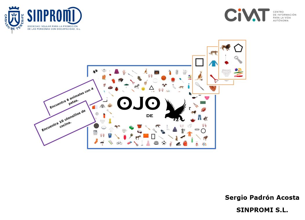 Tablero de juego DIN-A3 para trabajar la atención, discriminación y percepción visual. El objetivo de este juego es encontrar los elementos de las tarjetas de imágenes o frases, en el tablero de juego. Se tendrá que señalar con el dedo el elemento encontrado y decir su nombre.