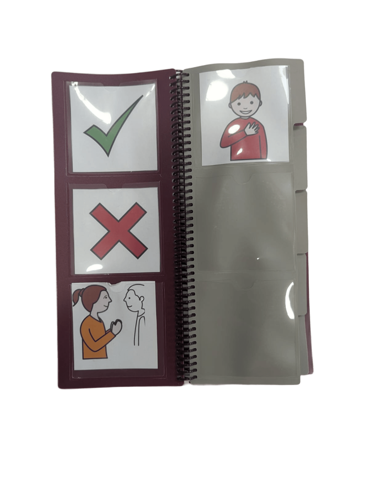 Una libreta muy sólida hecha para resistir a una manipulación diaria. Cada página de plástico posee un bolsillito transparente donde se puede insertar foto, ilustración, pictograma, ideograma, etc. Las pestañas, son utilizadas para clasificar la información por tema (en casa, en la escuela). Dimensiones 29,5×11,5 cm.