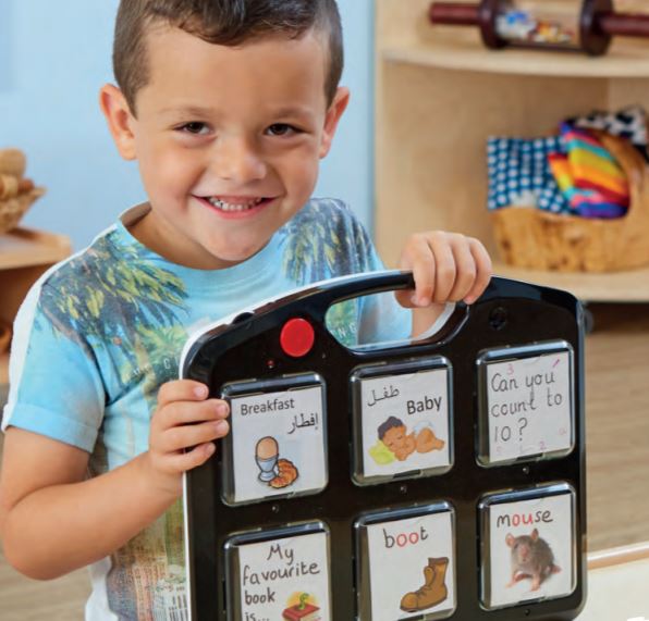 Maletín con seis botones grabables y personalizables con 60 segundos de reproducción cada uno. Puedes introducir imágenes,pictogramas o tus propios dibujos en las ranuras de los botones.