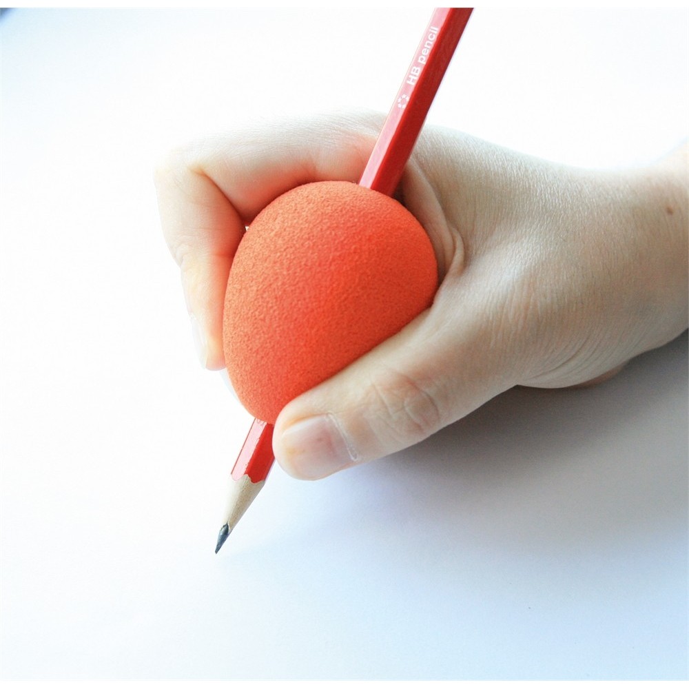 En forma de huevo, se puede adaptar a todo tipo de bolígrafo o lápiz. Hay que mantenerlo apretado entre los dedos para que no deslice. Si dejamos de apretar se desliza por el boli. Ayuda a mantener una posición correcta de los dedos y desarrollar la fuerza.