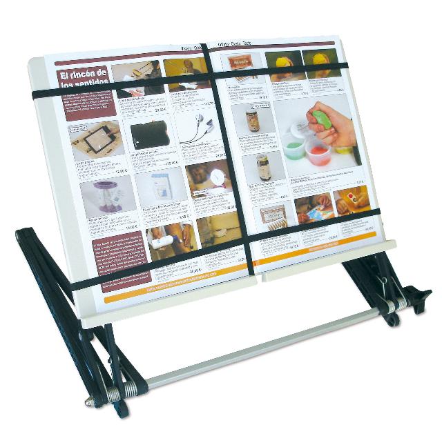 Mesa que se ajusta a diferentes posiciones, regulando su altura e inclinación. Dispone de cinchas que permiten la sujeción de libros y/o objetos.
