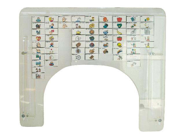 Mesa para fijar a la silla de ruedas realizada en acrílico transparente. Lo que permite ser usada como sistema de comunicación aumentativa y alternativa ya que pueden fijarse símbolos en la parte posterior permitiéndo a la persona señalarlos de forma sencilla.