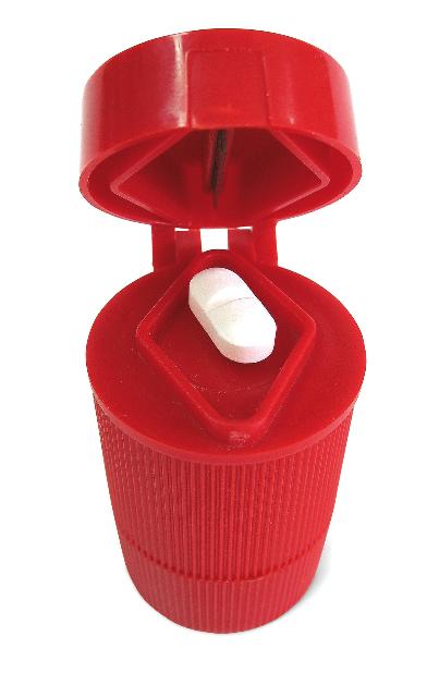 Tritura las pastillas para mezclarlas con bebidas o alimentos. Útil para personas con disfagia o incapaces de tomarse el medicamento entero. Sirve también para partirlas por la mitad, en la parte superior se incluye un compartimiento con separador para almacenar las pastillas