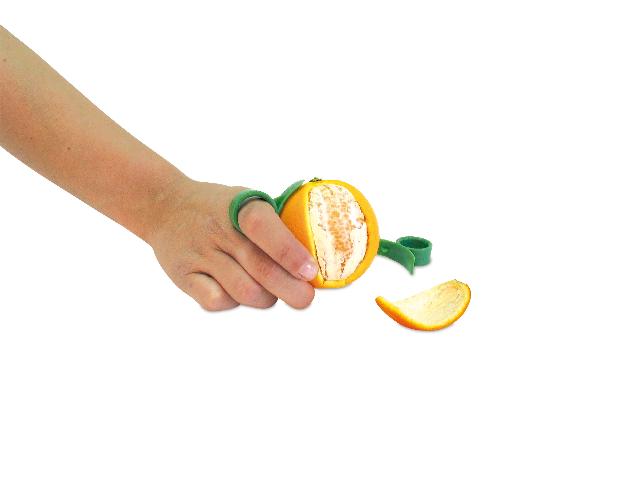 Un ingenioso dispositivo que permite pelar facilmente las frutas cítricas sin riesgo de cortarse con un cuchillo. Simplemente es necesario deslizar un dedo en la anilla para cortar la piel en secciones que se desprenden fácilmente.