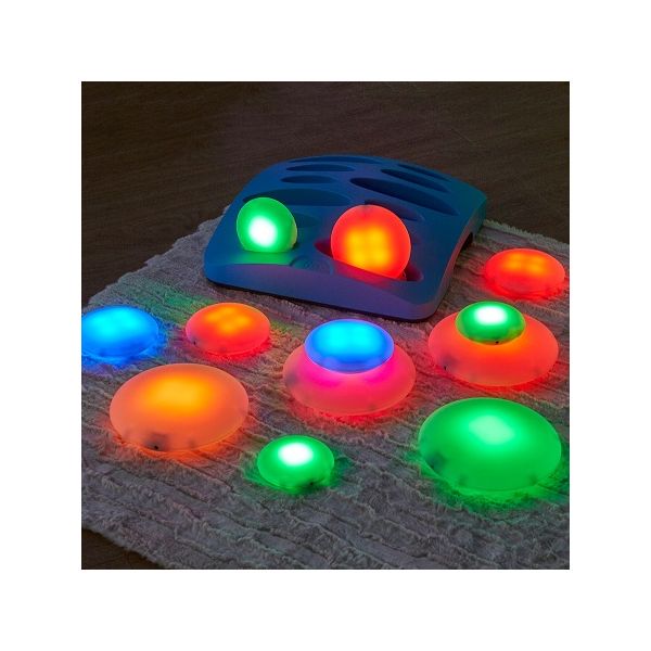 Juego de 12 piedrecitas iluminadas y recargables que pueden apilarse y echar a rodar para fomentar el aprendizaje sensorial interactivo. Las piedrecitas tienen tres tamaños diferentes y se cargan colocándolas en la base de carga. Es un recurso estupendo para las aulas sensoriales y una forma innovadora de alentar a los menores que experimenten y exploren.
