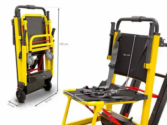 Esta nueva silla de rescate incorpora un innovador sistema de oruga eléctrico con dos modos de funcionamiento, ascenso y descenso, controlables mediante panel integrado, que facilitan el traslado de personas en caso de evacuación o emergencia. Especialmente diseñada para la evacuación por escaleras. Cuenta con reposabrazos y asideros abatibles para usar según cada situación y cinturones de seguridad.