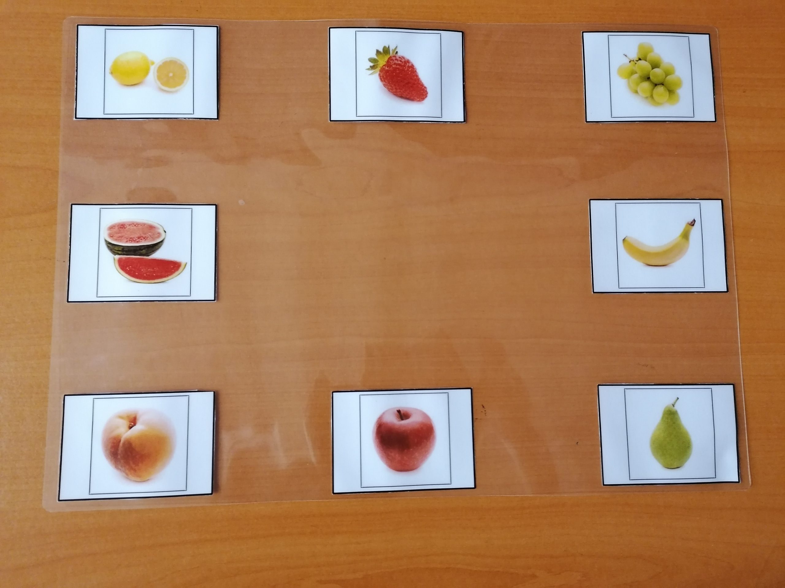 Tablero de comunicación visual plastificado, con imágenes reales. Las imágenes pertenecen a las frutas (9 elementos)