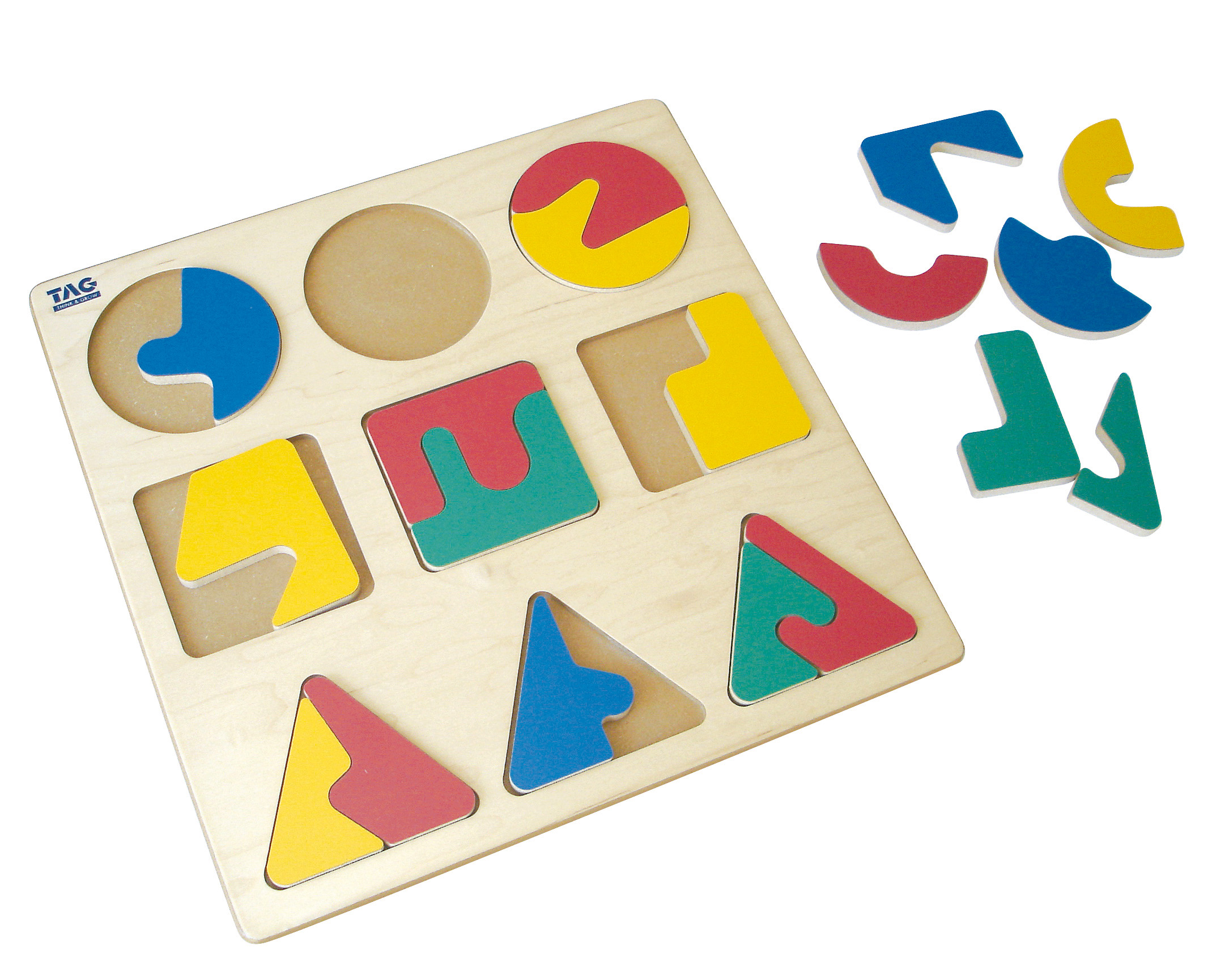 Puzle de formas coloreadas de madera, con acabados sin ángulos. Las nueve formas incluyen círculo, cuadrado, rectángulo, óvalo y estrella. Útiles para trabajar la discriminación de formas y desarrollar destrezas motrices finas.
