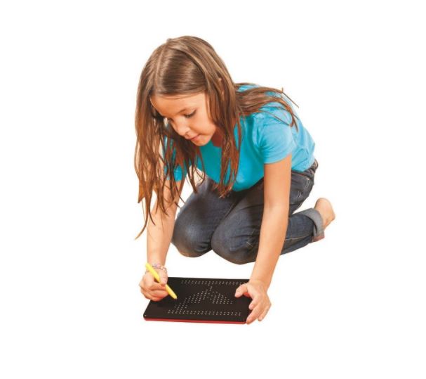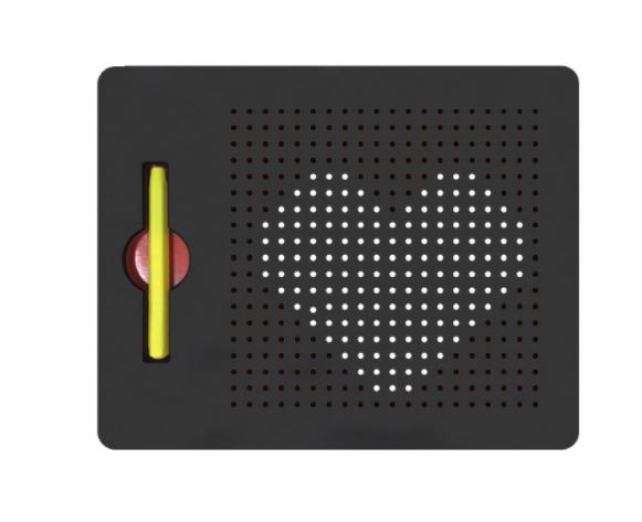 Soporte con una superficie perforada que contiene bolitas metálicas en su interior. Una sofisticada punta magnética extrae parcialmente hacia la superficie la bolita permitiendo componer dibujos, grecas, formas geométricas, letras, números o cualquier diseño con el que desarrolle su imaginación disfrutando, bien imitando una de las diversas propuestas que se adjuntan o diseñando una nueva. De esta forma, no solo desarrolla su capacidad de interpretación espacial sino que estimula también su propia imaginación de un modo fácil y divertido.