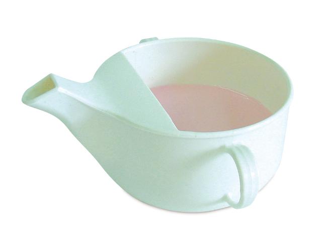 Taza de alimentación plástica con dos asas y tapa parcialmente cubierta para prevenir el escape de líquidos. El diseño en forma de tetera permite beber con un menor grado de inclinación.