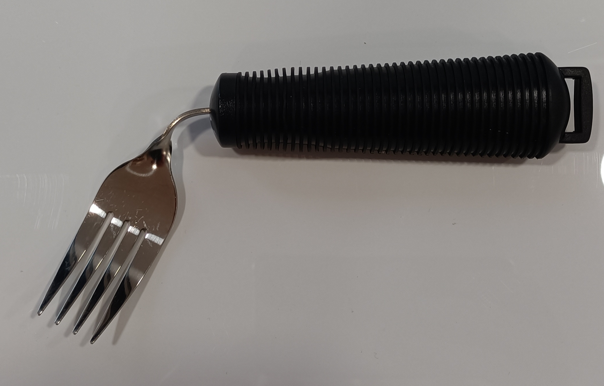 Tenedor de mango grueso estriado con posibilidad de curvarlo según la necesidad del usuario.
